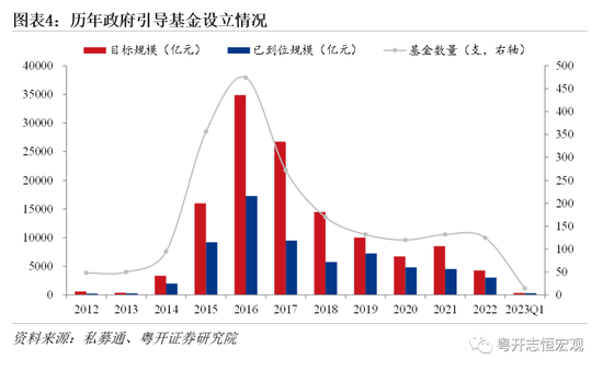 另一方面,部分观点认为“股权财政”即发挥国有资本的引领和带动作用,吸引社会资本参与投资具有核心竞争力的高新产业、国有资本实现保值增值,在实施资本市场有序退出后,投向下一个产业,实现良性循环。简而言之,政府将原项目中的财政拨款补助变为投资和股权,即“拨改投”,实际地方政府已经这样操作很多年了。进入21世纪后,政府希望解决创投企业股权融资市场失灵问题,又不希望以传统直接财政补贴的形式耗费大量财政资金,政府引导基金模式应运而生。自2002年我国第一支真正意义上的政府引导基金——中关村创业引导基金成立以来,政府引导基金已经从初步探索、规范发展,走到目前的精耕细作阶段。在财政资金紧张和经济结构转型升级背景下,各地政府通过政府引导基金招商引资的诉求不断增强。根据私募通数据,截至2023年第一季度,我国共设立2126支政府引导基金,目标规模12.9万亿元,已认缴规模约6.6万亿元。