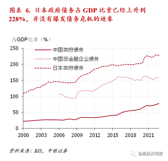 正面的例子是日本。2022年末,日本政府债务占GDP比重已经上升到228%,远高于我国77%的水平,甚至接近了我国政府债务和企业债务总和占GDP的比重。但由于日本国际收支长期健康(长期有经常账户顺差),且通胀长期处于低位,所以日本很高的政府债务水平并未带来什么严重后果,债务可持续性没有问题。(图表6)