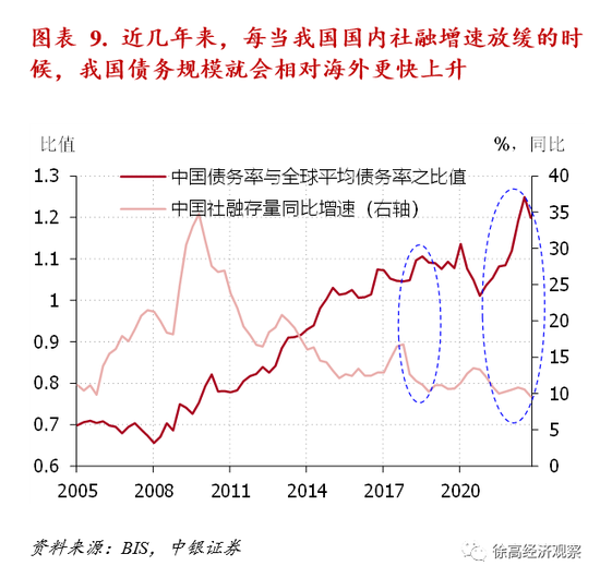 第一、去杠杆政策并未减慢国内债务率的上升速度,反而有推高债务率的倾向。2018-2019年、以及2021-2022年,是我国两波强力去杠杆政策的推进期。在这两段时间里,国内社融增速明显放缓,但同期我国债务率(债务占GDP比重)与全球平均债务率的比值却不降反升,表明在这两段时间里,国内债务率升幅反而更明显地超过国际平均债务率的升幅。事实上,观察过去几年我国债务率和全球债务率的比值数据,可以发现它与我国社融增速负相关,表明去杠杆政策倾向于让国内杠杆率更快上升,放松去杠杆政策反倒有助于减缓国内杠杆率的升势。(图表 9)