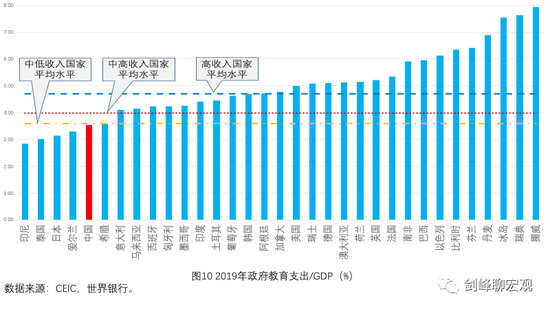 从发达国家的情况看,北欧的福利主义国家,如挪威、瑞典、丹麦等,政府教育支出/GDP远远超过了高收入国家平均水平(这些国家用于生育养育的财政支出也远高于其他发达国家);而政府教育支出/GDP低于高收入国家平均水平的发达国家,如葡萄牙、西班牙、意大利、希腊等,都是欧元区中经济困难、政府债务压力巨大的失败国家;至于早已经陷入长期停滞的日本,政府教育支出/GDP奇低——在前面的讨论中,我们已经指出了日本财政支出存在的问题。