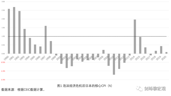 日本经历了几十年的通货紧缩,但通货紧缩只是长期停滞(secular stagnation)的症状之一。1990年泡沫经济危机破灭后,日本即陷入到长达几十年的经济停滞中,实际GDP几乎零增长,名义GDP负增长。日本学者将这种停滞称作“日本化”(Japanization),并给出了日本化的三个主要特征:总需求不足使得产出低于潜在产出水平,自然利率持续下降并变成负值,通货紧缩。