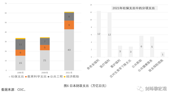 观察日本财政支出(图6),社保支出一直是占比最高的科目。2021年社保支出高达43万亿日元,其中用于老年人的养老金福利、医疗福利高达24万亿日元,而用于应对生育率下降的支出只有区区的3万亿日元。在一个人口负增长如此严重的国家,对生育养育的支出如此之抠门,令人惊讶无比。与日本相对比,瑞典、瑞士这些北欧福利主义国家在上世纪80年代就将鼓励生育养育纳入宪法,并对生育养育提供了慷慨的财政补助。所以,安倍晋三的《日本“一亿总活跃”计划》之所以失败,就很好理解了。