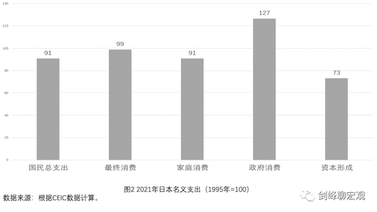 在长期停滞的过程中,日本的通货紧缩是总需求萎缩所致,即“坏的”通货紧缩。观察日本的名义支出,直到2021年国民总支出尚未恢复到1995年的水平,更不用说跟泡沫经济破裂前的1989相比。在各项支出中,26年间家庭消费支出萎缩了9%,资本形成(即投资)更是萎缩了27%。在私人部门消费、尤其是投资不振的情况下,唯有政府消费在勉强支撑着总需求。那么,需求不足是因为财政政策和货币政策的扩张力度不够吗?