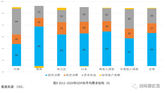 从供给侧生产函数的角度看,造成资本积累悖论的主要原因在于人口/劳动力增长率下滑、乃至负增长。从需求侧的角度看(图9),造成资本积累悖论的主要原因在于中国居民的消费率(居民消费/GDP)太低,从而人为抬高了投资率(投资/GDP),而投资率高本身就是投资效率和MPK低的直接反映。以2012至2021年的平均数据看,中国的投资率比全球平均水平高出了19个百分点,居民消费率则低了18个百分点。与发达国家相比,这种投资率高、消费率低的特征更加明显。