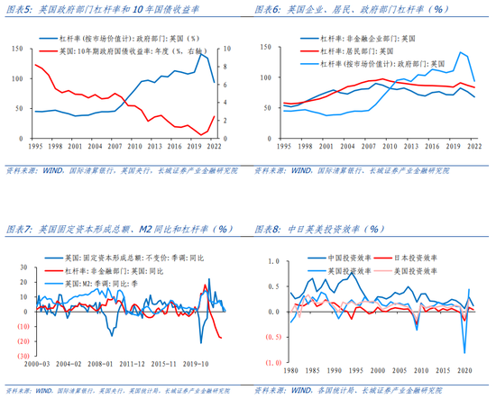 2022年,英国十年期国债利率上升了166BP,价格的下跌带来英国政府债券市值的下降,而同时国内生产总值增长较快,分子端下降、分母端上升,政府部门杠杆率呈现大幅回落的态势。相对于中国,英国对债务的依赖并不高。2012年时英国非金融部门杠杆率远远高于中国,两者同时发生了转折性变化,此后中国非金融部门杠杆率以更快的速度在上升,而英国以更慢的速度在上升。反观这一期间英国的资本形成总额增速明显高于M2增速,也高于非金融部门杠杆率增速,可以看出其增长并不依靠债务,其投资效率也较高。