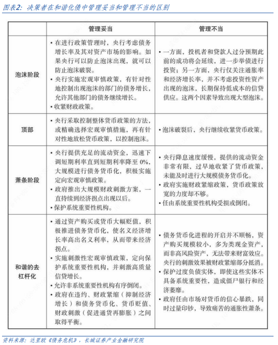 首先是改革,打破软约束机制,建立法治化的破产制度、市场化的投融资体制和畅通的货币传导机制,深层次结构化改革为低债务发展做好制度准备;其次化债,大规模财政刺激和宽松货币政策的同时进行市场化法治化债务重组,政府用转移支付或注资方式来置换私人债务;最后恢复,化债结束后释放私人部门需求,达到高质量的宏观经济结构,发展服务业来持续增加消费和保障长期国内收入,发展制造业维持世界出口份额获取海外收入,以时间换空间,不断减轻政府债务压力,最终成为低债务率国家。