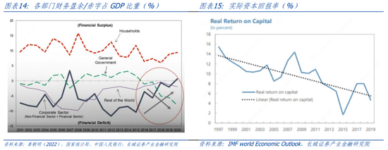 企业储蓄在中国是仅次于居民储蓄的第二大储蓄来源,但企业部门又是持续净融资部门,只是疫情之后才转化为净存款。在辜朝明对中国各部门资金流动表分析中可以看出,2015年之前中国企业都是以投资为主,在高利润的背景下高借贷,扩大再生产。2015年之后中国企业一直在大幅减少贷款,投资放慢。虽然辜朝明认为这种形势很危险,但其并未指出出现这种情况的具体原因。我们在《如何看待IMF下调中国中期GDP增速?》中已经阐述IMF测算中国的资本回报率是持续下降的,投资是过度的。张斌的《从制造到服务:结构转型期的宏观经济学》认为:中国从2012年开始就处于从制造到服务的经济结构转型进程中。我们在《产出缺口与通货膨胀》中也提到2012年之后中国就长期存在产能过剩,需求不足的现象。这就把2015年前后企业的现金流变化解释清楚了。由于中国投资率持续高于消费率,造成大量的投资转化为商品供给时,远远超过低消费率带来的商品需求,产能严重过剩。这种情况下,企业逐渐减少投资,增加现金流,此时企业应该增加消费,维持国内经济的供需平衡,但由于债务压力过大,预期物价持续下降,企业也开始增加储蓄,减少当期消费。