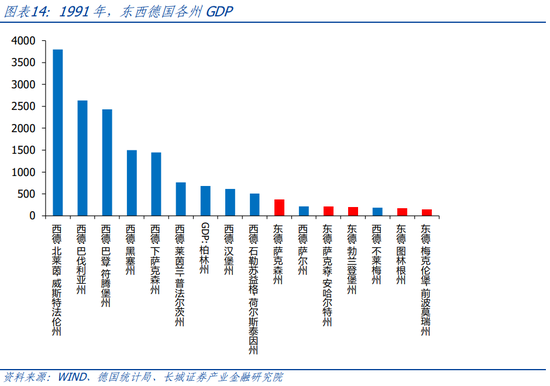 财政政策也服务于平衡地区发展的特定目标,1991-1996年德国政府进行债务扩张。德国政府为了支持东部发展,进行了大量的财政倾斜。但债务扩张也主要表现在中央政府,地方债务债务仍被严格控制。1991年至1996年,德国一般政府债务占GDP比重上升18.8个百分点至57.8%,而中央政府债务占GDP比重上升14.5个百分点至37.3%,也就是说地方政府债务占比仅上升了4.3个百分点。扩张的财政加快了东德地区发展,1992年,东德五州GDP同比25.8%,此后几年也都高于德国全国的GDP增速。