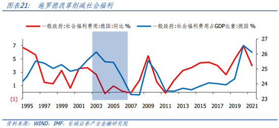 德国施罗德政府着手解决财政和债务问题。2003年3月14日,施罗德表示“德国经济目前所面临的困境迫使德国政府在财政紧缩、经济增长和减轻税务负担之间寻找一个新的平衡点”,随后提出“2010议程”,宣布削减社会福利并实施有利于就业的措施。2005年,默克尔上台后继续推动改革。2003-2007年,施罗德改革促使德国社会福利费用增速和占GDP比重明显下降,2007年,德国政府实现财政盈余。