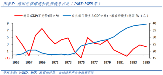 联邦德国“总体调节”的反周期财政政策经过三次危机,最终导致联邦债务负担加重。1966-1967年,德国经济衰退,政府扩张财政导致一般政府债务占GDP比重提升2.7个百分点至20.8%,而后紧缩财政,债务率重新降低。1973年-1975年,第一次石油危机,财政扩张导致政府债务率从17.4%上升至23.7%。但这一次危机之后,德国政府并未降低债务率。在1980年-1982年的第二次石油危机期间,德国政府债务率从30.2%继续上升至36.6%。