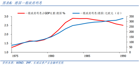 1980年开始,货币贬值和高利率导致政府债务压力剧增。一方面,由于德国贸易多年逆差,其中1980年贸易逆差438亿美元,创造历史记录,1979-1985年德国马克持续贬值。另一方面,高通胀导致德国提高利率。德国长期国债收益率从1978年4月的5.7%上升至1981年9月的10.6%,这增加了德国政府的债务成本。1980-1983年,德国一般政府利息从149.5亿增加至260.5亿欧元,占GDP比重从1.89%上升至2.89%。
