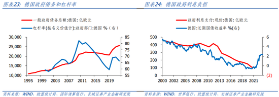 财政赤字转化为政府债务持续上升。2001年至2010年,德国政府债务从1.26万亿上升至2.10万亿欧元,之后发生欧债危机,德国政府债务进一步增长至2013年的2.20万亿欧元。德国政府部门杠杆率2010年达到了82.2%。在2012年之前,虽然德国长期国债收益率下降,但由于政府债务规模的增长,德国政府每年支付的利息仍维持在400亿欧元上下,形成了一定的债务负担。