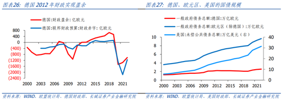 其次,德国财政收支扭亏为盈,有效控制债务增长。2012年,德国财政从前一年的赤字237.41亿欧元变成盈余2.56亿欧元,此后直到2020年疫情之前,德国财政一直保持盈余。德国政府债务规模也随之降低,从2012年的2.20万亿欧元降低至2019年2.07万亿欧元。作为对比,2012-2019年,欧元区除德国外的政府债务从6.74万亿增长至8.01万亿欧元,美国国债规模从16.43万亿增长至23.20万亿美元。