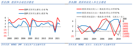 首先,德国政府及时“债务刹车”,在欧债危机中经济稳定增长。2009年12月,三大评级机构下调希腊主权信用评级,欧债开始爆发主权债务危机。2009-2011年,希腊一般政府债务率从127.8%上升至184.0%,“欧猪五国”平均一般政府债务率从89.5%上升至119.7%。而德国一般政府债务率在2010年达到81.0%后就不断下降。由于德国政府对债务的管控,欧债危机对德国的影响较小,德国实际GDP在2010年和2011年分别同比增长4.19%和3.91%。