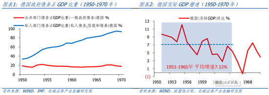 1949-1966年,在弗莱堡学派国家有限干预原则的影响下,联邦德国实行谨慎的财政收支平衡政策。这一时期,联邦德国控制政府的财政支出来平衡财政预算。政府对经济干预较少,经济增长主要靠市场机制调节。相较于私人部门债务占GDP比重的持续上升,政府部门债务占GDP比重在这一时期基本维持稳定。这一财政政策配合马歇尔计划帮助联邦德国在二战后迅速复苏。