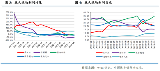 从利润占比来看,继续呈现出由采矿和消费制造板块向装备制造板块倾斜的趋势。1-6月份,采矿业利润占比下降2.1个百分点至20.1%,消费制造利润占比下降0.4个百分点至20.5%。与此同时,装备制造占比提升2.6个百分点至34.3%,原材料制造下降0.3个百分点,电热气水上升0.2个百分点。