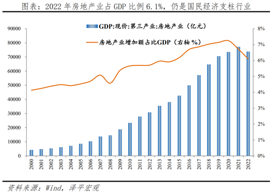 (一)房地产是国民经济的重要支柱,2022年房地产业增加值为7.3万亿元,占GDP的6.1%