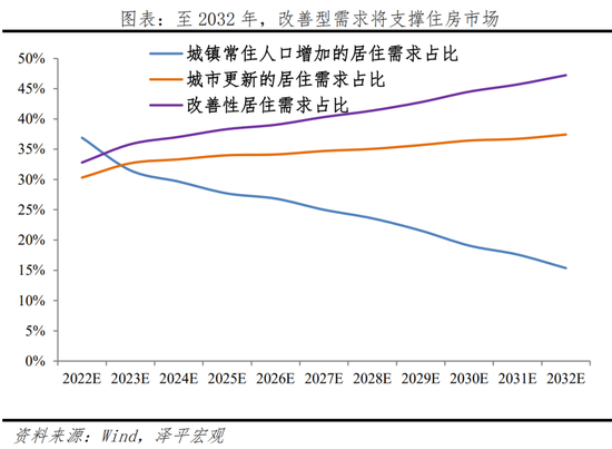 2023年我国每年新增城镇居住需求约12亿平方米,城镇常住人口增加(剔除行政区划变动,后同)、居住条件改善、城市更新需求分别占总需求的31.5%、32.7%、35.8%。2032年总需求波动降至10亿平方米,城镇常住人口增加、居住条件改善、城市更新需求分别占总需求的15.4%、37.4%、47.2%。改善性需求总量、占比均呈现逐年增长趋势,2023年后有望超越城镇常住人口增长带来的需求成为最大的需求。