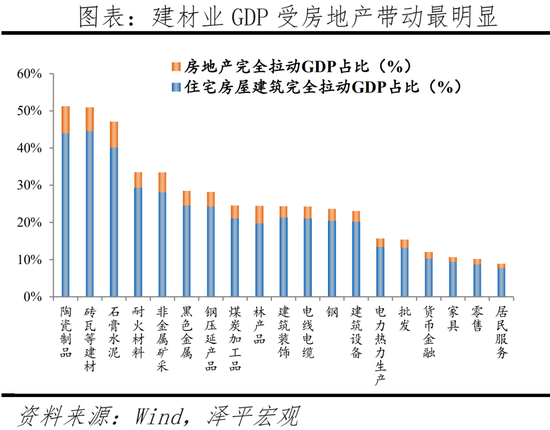 分行业看,货币金融、零售、钢压延、石膏水泥由广义房地产行业拉动的GDP增加值居前列,分别为8107亿元、4230亿元、3527亿元、2820亿元。陶瓷制品、砖瓦等建材、石膏水泥由房地产完全拉动的GDP占该行业总GDP占比最高,高达51.2%、50.9%、47.1%。