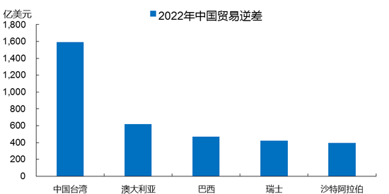 2022年,全球疫情好转背景下,中国疫情有所反复,导致下半年出口增速明显回落,出口的全球份额也回落至14.4%,但总体看还是遥遥领先于其他经济体。中国出口顺差的第一大国一直是美国,在美国不断挑起贸易纷争、企业制裁、芯片、人工智能等技术封锁等打压手段不断延续的背景下,2022年对美出口顺差仍高达4000亿美元。