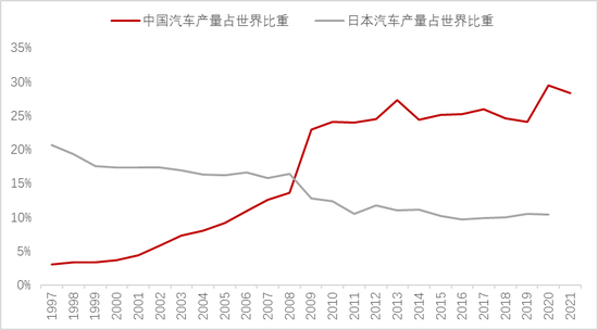 中国出口产品中,机电产品出口已经占了大头,而不再是服装鞋帽和玩具,这是由中国制造业占全球比重不断上升所决定的。以中日韩三国的工业增加值占全球比重为例,中国到2021年已经上升至26%,而日本则从1994年的20.7%降至2021年的6.5%。