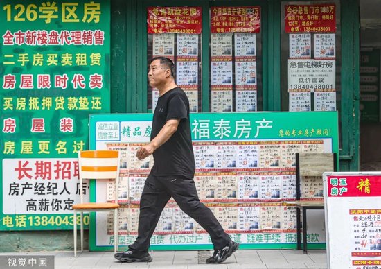 2023年8月3日,沈阳,市民在一房产中介贴出的学区房、二手房信息旁经过。图源:视觉中国