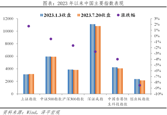 从股市看,2023年以来,股市主要指数表现低迷。上证指数、中证500指数、沪深300指数、深证成指、中国香港恒生科技指数、创业板指数涨幅分别为+1.7%、-0.5%、-1.7%、-2.7%、-4.0%、-8.5%。