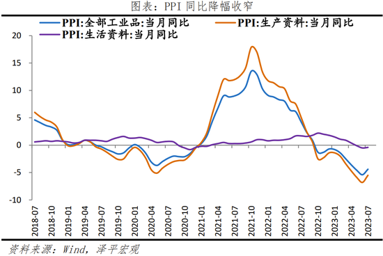 在国际大宗商品价格走强、政策提振信心、库存去化至降低水平、工企利润降幅收窄等因素下,7月PPI降幅收窄。7月PPI环比下降0.2%,降幅较上月收窄0.6个百分点;PPI同比下降4.4%,降幅较上月收窄0.1个百分点。在7月份PPI的同比降幅中,翘尾影响约为-1.6个百分点,新涨价影响约为-2.8个百分点。