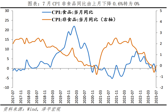 第一,CPI同比负增长为高基数所致,CPI和核心CPI环比均由跌转涨。7月CPI环比由上月下降0.2%转为上涨0.2%;同比下降0.3%,较上月下降0.3个百分点。同比降至负增长主要受高基数影响,其同比降幅中,翘尾影响约为0个百分点,新涨价影响约为-0.3个百分点。核心CPI同比上涨0.8%,较上月提升0.4个百分点;核心CPI环比由下降0.1%转为0.5%。
