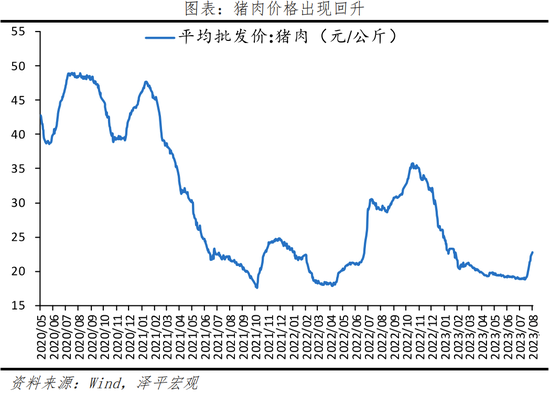 二是猪价受猪周期下行期处底部等因素影响,环比降幅收窄。7月处畜肉淡季,但猪价下行底部显现:7月猪价环比由-1.3%上升为0%;猪价同比下降26.0%,较上月大幅下跌18.8个百分点,影响CPI下降约0.41个百分点。