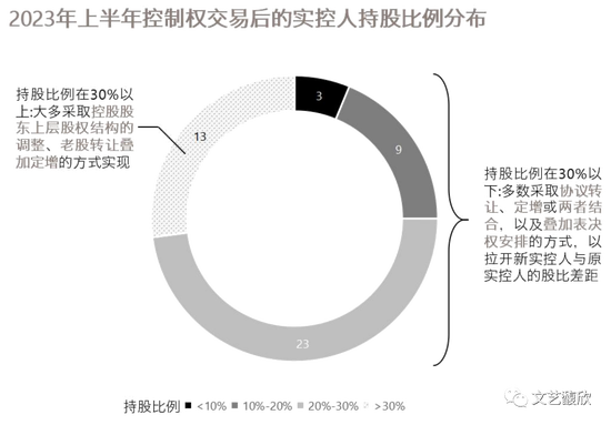 就变更后实控人的持股比例分布看,剔除无实控人的情形后,实控人持股比例在10%以下的有3家;10%-20%的有9家;20%-30%的有23家;30%以上有13家。持股比例在30%以上的大多采取控股股东上层股权结构的调整、老股转让叠加定增的方式实现。持股比例在30%以下的多数采取协议转让、定增或两者结合,以及叠加表决权安排的方式,以拉开新实控人与原实控人的股比差距。