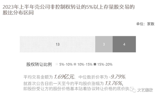 4、 壳公司不涉及控制权的5%以上存量股协议转让交易活跃,且交易后股价表现亮眼。但这类壳公司如果未来仍希望出售控制权,这样的操作一来抬高了公司市值超出当前市场的交易市值水平,二来股权结构进一步分散,对于产业背景的买方来说,将不再是优先选择。