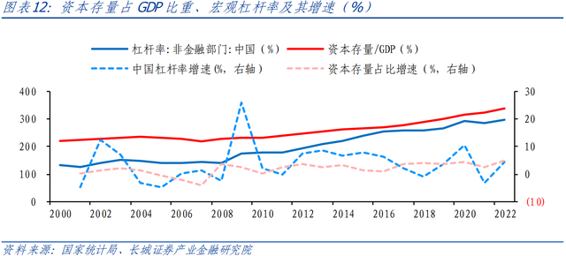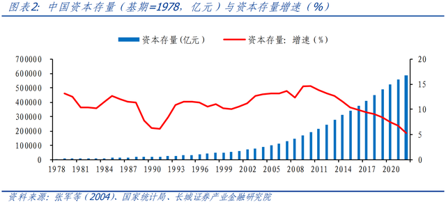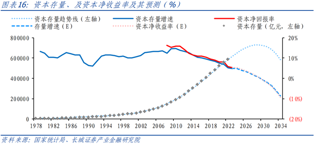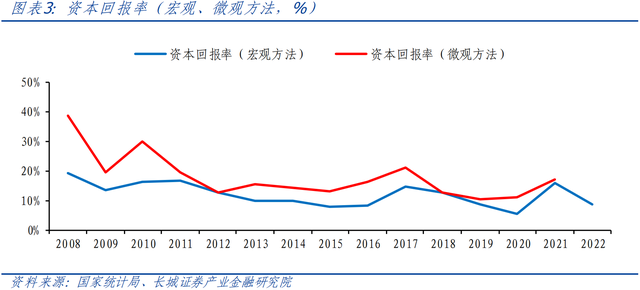 从宏观和微观两种方式测算的资本回报率走势非常相近,整体表现出下降态势。2008年时宏观资本回报率还20%左右,之后几年保持平稳,2012年之后快速下降。其中2016-2017年受益于房地产去库存政策,资本回报率短暂回升,但2018年之后又进一步下降,2020年时达到最低值5.6%,2021和2022年又再次反弹。资本净收益率自2008年以来持续下降,至2022年时已降至8.6%。从资本存量的增速来看,2012年之前基本上在10%以上保持平稳,但2012年之后呈现快速回落态势,可以看出扣除资本溢价的资本净收益率的下降已经在降低投资增速。