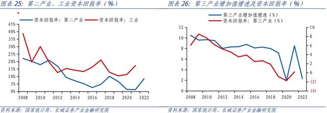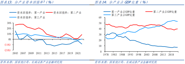 在产业结构上,随着我国工业化进程已经走完,消费已经升级至以服务消费为主的第五轮阶段,第三产业占GDP比重在2012年时超过第二产业并继续抬升,第二产业占比不断下降,这也导致资本回报率不断下降。根据我们的测算,2007年时第二产业资本回报率接近30%,第三产业资本回报率只有10%左右,差距较大;到2022年时第二产业资本回报率已经降至8.6%,第三产业也到0.2%,均在不断走低。尤其2020年之后受新冠肺炎疫情冲击,第三产业的资本回报率变负,大量破产和失业出现。同时第一产业的资本回报率在2010年之后就一直为负,这也解释了为何农民工持续外出打工,土地收入较低的原因。