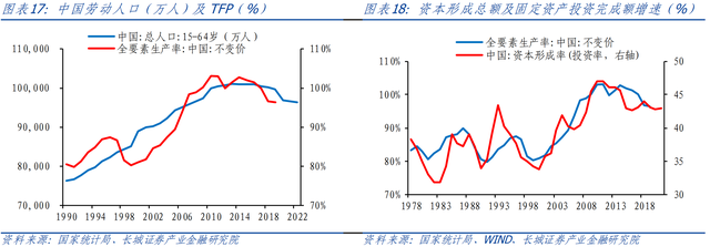 显然在我国,实际资本回报率持续下行的原因除了经济增速下降之外,还有资本收入份额下降。在经济增长因素中,2013年中国劳动力人口见顶之后持续下行给经济带来压力。我们在《中国生育率研究》和《中国人口趋势研判及建议》里已经做过相应分析,由于老龄化加剧和出生人口下降,未来劳动力人口还会下降。关于全要素生产率,我们在《中国潜在经济增速初探》中已经做了假设,最好的结果就是能按照德国当年的发展模式保持全要素增速稳定。但从中国的过去经验来看(图18),随着投资增速的下降,全要素生产率也会跟着下降。