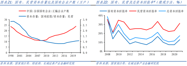 根据我们的测算,2008年以来国有企业的资本回报率持续低于民营,2021年时工业部门民营资本回报率是31.3%,国企资本回报率仅有12.9%。在2008年之后我国经济结构中国有企业占比也逐渐提升,造成整体资本回报率不断从民营靠近国有,验证了宋铮的预判。CCER(2007)研究也发现私营企业资本回报率明显高于国企。邵挺(2010)认为在金融资源错配的情况下,私营企业比国有企业具有更高的资本回报率[9]。IMF在中国2022年第四条磋商报告中认为:缩小国企和民企之间的生产率差距会提高全要素生产率大约6个百分点。