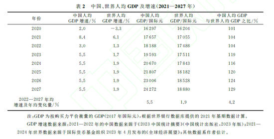 未来五年,中国将迈进中等发达国家门槛。进入21世纪,中国人均GDP增长实现了跨越式发展,从低收入水平(2000年为3452国际元)到中低收入水平(2008年为7413国际元,超过中低收入国家平均水平的7222国际元),再到2022年中国人均GDP为18188国际元,已高于2022年世界人均GDP的17486国际元,也高于世界中高收入国家人均GDP的18097国际元,这是全面建成小康社会最重要的标志之一。预计中国人均GDP将由2022年的18188国际元增长至2027年的24272国际元,年均增速为5.5%,比同期世界人均GDP增速(1.9%)高出3.6个百分点。中国人均GDP与世界人均GDP之比将从2022年的104%提升至2027年的129%(见表2),已接近OECD国家中智利的水平(2021年为25449国际元),可视为迈进中等发达国家门槛,也为到2035年中国进入中等发达国家行列奠定了更高的发展基础。为此,确保未来五年中国GDP或人均GDP实现5.5%或5.5%以上的增速预期目标不仅十分重要,而且也是实现其他经济社会发展指标预期目标的重要经济基础。