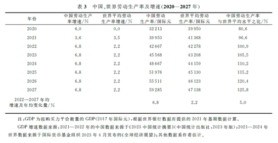 未来五年,中国劳动生产率再上新台阶。中国劳动生产率由2010年的16083国际元提升至2021年的33377国际元,平均增速为6.9%,比同期世界平均增速(1.9%)高出5个百分点,比同期美国平均增速(1.1%)高出5.8个百分点⑩。这表明,尽管中国的劳动生产率水平目前仍明显低于美国,但已显示出中国对美国劳动生产率的加速追赶,这是中国实现人均GDP追赶美国的主要途径和根本原因。诚如列宁所言:劳动生产率,归根到底是使新社会制度取得胜利的最重要最主要的东西瑏瑡。中国劳动生产率呈中高速增长趋势,预计将从2022年的42667国际元增长到2027年的59285国际元,年均增速为6.8%,比同期世界劳动生产率的平均增速(2.2%)高出4.6个百分点。中国劳动生产率与世界劳动生产率平均水平之比由2022年的100.9%提升至2027年的125.8%(见表3),即比世界平均水平高四分之一以上。这表明,中国经济增长的主要驱动力已经不再依靠劳动投入增长。我国劳动力投入实际上已在2017年达到最高峰(76058万人),然后开始逐渐下降,到2022年已降至73351万人,减少了2707万人,相当于平均每年减少541万人。这主要是依靠提高劳动生产率水平实现的,得益于劳动者人均固定资本存量水平、人力资本水平(平均受教育年限)、劳动力质量水平(专业与技能)的提高,以及从低劳动生产率部门(主要是农业)加速向高劳动生产率部门转移等长期性、结构性因素的持续提高和改善。我国已形成了长期性、结构性、综合性效应促进全国及三大产业劳动生产率持续提高:一是劳动生产者物质资本即人均资本存量的不断提高。二是劳动力人力资本水平的不断提高,这既包括劳动生产者健康水平的持续提高(比如2010—2020年期间劳动力平均预期寿命增加了3岁,即平均每年增加0.3岁),又包括劳动力教育质量的提高(比如劳动力平均受教育年限水平达到10.8年,具有大专及以上学历的劳动力占劳动力总数的比例增加),全国人均受教育年限增加了1.0年,即平均每年增加0.1年,新增劳动力平均受教育年限已经达到14年(相当于大学二年级),今后每年大专以上毕业生超过1000万人,到2027年累计将超过5000万人,成为超大规模的新增人力资本,抵消了人口红利减少的影响。三是劳动力持续从低劳动生产率部门(农业部门、农村地区)向高劳动生产率部门转移(非农业部门、城镇地区),与此同时,农业就业比重减少了13.1个百分点、农村劳动力比重减少了16.0个百分点瑏瑢;随着人均预期寿命持续提高,根据党的二十大报告精神,国家将实施渐进式延迟法定退休年龄[1],提高退休费水平的预期,延缓城镇职工大规模退休潮。这也正是中国经济高质量发展的重要特征,即从劳动数量效应为主转向劳动质量及结构性变量综合效应,既不断提高全要素生产率效应,也不断提高劳动生产率效应,进而提高个人收入以及退休费水平预期。
