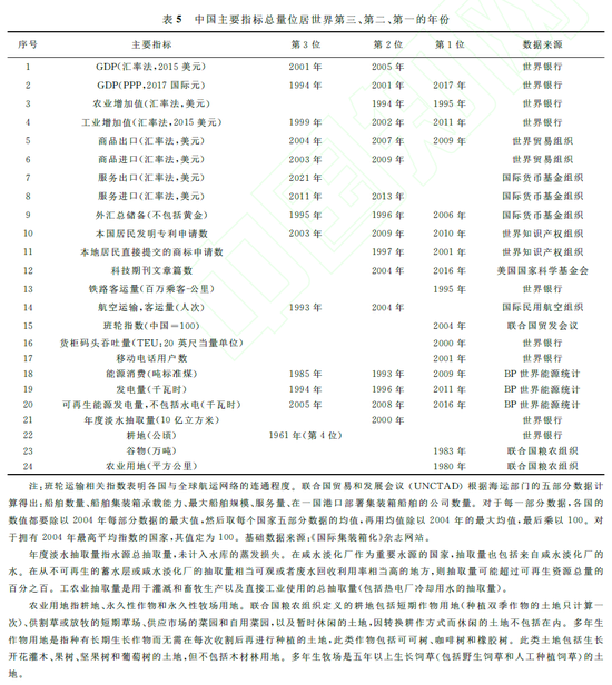 事实上,中美经济实力、产业实力、科技实力、贸易实力、综合国力差距正在加速缩小,中美战略竞争已进入白热化、长期化阶段是不争的事实。一是中国与美国早已进入经济“大竞争”时代。根据世界银行数据库提供的权威数据,按照购买力平价2017年国际元计算,2010年中国GDP仅相当于美国GDP的70%,但2017年中国已超过美国,2021年中国已相当于美国的1.18倍。我们预计:到2030年,中国GDP约为美国的1.6倍左右;到2035年,将达到2倍以上。二是中国与美国进入科技“大竞争”时代。按照购买力平价2017年国际元计算,2022年中国的研发支出为7368亿国际元,占GDP比重为2.55%;2021年美国研发支出为7290亿国际元,占GDP比重为3.45%。2022年中国研发支出已超过美国,预计到2027年相当于美国研发支出(8742亿国际元)的1.14倍。事实上,中国发明专利的申请量和授权量均已大大超过美国,2020年中国本国居民发明专利申请量已经相当于美国的4.98倍,但是在核心技术上,如芯片等,还受到美国的严格限制和封锁。三是中国与美国进入综合国力“大竞争”时代。从综合国力视角来看,中国实现了对美国的全面加速赶超。在作者所归纳的中国的24个主要指标中,中国居世界第一的指标2000年有5项、2010年有12项、2021年有17项(见表5)。其中,根据世界银行提供的数据,按购买力平价2017年国际元计算,中国GDP相当于美国的比重从1990年的16.0%上升至2021年117.7%,与美国中央情报局数据库提供的数据高度一致。发电量是反映一个国家现代化水平的重要指标,根据英国石油公司发布的《2021世界能源统计》,中国2011年的发电量就已超过美国,2020年中美两国发电量占世界总量的比重分别为29.0%、16.0%,中国相当于美国的1.81倍。这表明,中美综合国力对比已经发生历史性、根本性的重大变化,时间掌握在我们手里,诚如毛泽东在1970年5月20日发表的声明:“无数事实证明,得道多助,失道寡助……这是一条历史规律。”[8]