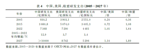 未来五年,我国研发支出将跃居世界前列。中国研发支出与GDP之比持续提高,从2015年突破2.0%到2022年突破2.55%,预计2027年将提高至2.8%左右,首次高于OECD国家2021年的相应比值(2.71%)。根据OCE Ddata网站数据,按购买力平价计算,2015年中国研发支出为3660.8亿国际元,已超过了欧盟总研发支出(3405.3亿国际元);2022年中国研发支出为7368亿国际元,首次超过美国(7290亿国际元),相当于欧盟(4481亿国际元)的1.64倍(见表4)。预计2027年中国研发支出占GDP的比重将达到2.8%左右,总额将超过一万亿国际元,比2022年增长35.7%,也明显超过美国的研发支出(8742亿国际元),将跃居世界第一。