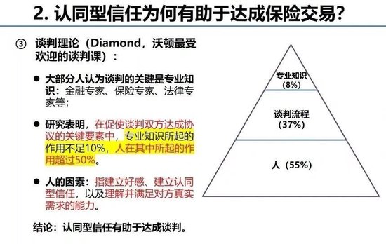郭振华教授在讲到认同型信任有助于达成保险交易时,还引用了世界一流谈判专家Diamond在沃顿商学院最受欢迎的谈判课中所用的谈判成功三角模型。