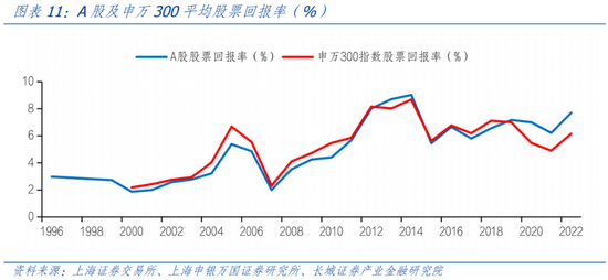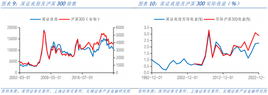 通过计算1992年以来深证成指平均实际回报率只有2.81%,而2004年以来深证成指和沪深300指数的平均实际回报率分别为6.94%和8.31%。通过计算市盈率倒数的预期收益率1996年以来上证所为5.1%,2004年以来的沪深300为7%。通过计算上市公司的ROE1996年以来上证所为6.6%,2004年以来的沪深300为12%。