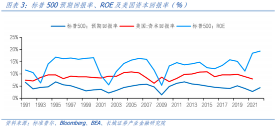 可以看出2000年之前由于高通胀和交易所初创,资本市场还未成熟,测算出来的股市投资回报率偏低,与此时处于历史较高水平的资本回报率不符,不具有参考意义。2000年以来的深证成指代表的A股平均实际回报率为6.19%, 2002-2022年以沪深两市市值加权代表的A股市盈率倒数的预期收益率为5.18%,ROE为8.88%,可以看出A股预期回报率与美国的7%左右相差小于一个百分点,ROE也高于前两者。相对应的市盈率在19倍中枢水平上。