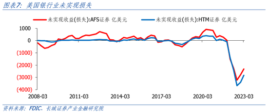 第二,高利率环境下,美国银行业未实现损失数额巨大。2023年一季度美国银行业持有AFS证券未实现损失2315亿美元,HTM证券未实现损失2840亿美元,合计超过5000亿美元。如果利率继续上升,这些未实现亏损或将逐渐兑现并且再次引发流动性危机,那么银行业又将面临巨大的风险敞口。因此,美联储下一步的货币政策是决定美国银行业风险是否会再度爆发的关键。
