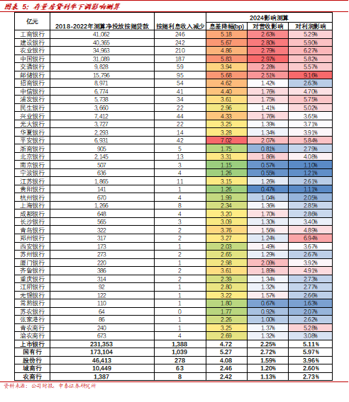 则对上市银行息差、营收、税前利润贡献在2.4bp、1.1%、2.6%。由于农商行1-5年期存款占比较高,因此对息差贡献最大,为3.3bp,其次依次为城商、大行和股份行,分别贡献2.5bp、2.4bp、2.1bp。对农商、城商、大行和股份行营收分别影响为1.5%、1.2%、1.25%、0.8%。