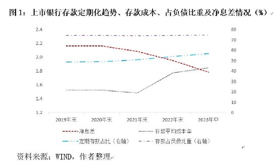 第二,从调整原因来看,此次存款利率调整是两方面因素共同作用的结果。一是银行响应存款利率市场化改革的要求。近年来,我国存款利率市场化改革稳步推进。2021年6月,人民银行将商业银行存款利率上限由原本的存款基准利率浮动倍数改为加点确定,旨在引导存款市场有序竞争、优化存款利率自律上限。2022年4月,人民银行指导利率自律机制建立了存款利率市场化调整机制,赋予存款利率调整更多“随行就市”的市场化特征。2022年9月和2023年6月,商业银行已经先后两次调降存款挂牌利率,推动利率保持在相对合理水平。此次存款挂牌利率再次下调,既是对前期存款利率市场化改革成果的延续,也是响应存款利率定价改革与存款利率市场化调整机制改革要求的重要表现。二是银行根据市场变化和自身经营发展需要做出的主动调整行为。从负债端来看,2022年,我国银行存款出现超速增长,定期化趋势明显。2023上半年,58家上市银行存款规模达197.01万亿元,较上年末增长近10%,增势依然延续,存款占负债比重也进一步达到阶段性高位。同时,存款定期化趋势更加明显,定期存款占存款总规模比重突破55%水平,较上年末进一步上升,长期限存款占比也有所提升。相应地,银行存款成本持续上升,加剧负债成本上行压力(图1)。从资产端来看,随着银行不断让利实体经济,持续降低实际贷款利率,推动实体企业综合融资成本下降,使得资产端贷款收益水平在一定程度受限。在近期存量按揭利率下调政策落地的背景下,未来银行存量房贷利率面临调降压力,导致净息差持续承压,银行经营面临一定挑战。因此,银行要稳定净息差空间,保障经营和抗风险能力,调降存款利率对冲压力的主动调整行为应运而生。