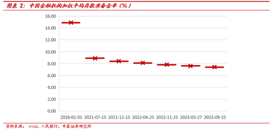 事件:央行降准25BP。为巩固经济回升向好基础,保持流动性合理充裕,中国人民银行决定于2023年9月15日下调金融机构存款准备金率0.25个百分点(不含已执行5%存款准备金率的金融机构)。本次下调后,金融机构加权平均存款准备金率约为7.4%。