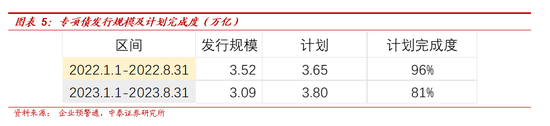 二是9月为政府债发行高峰,降准与财政政策相互配合。根据8月28日《国务院关于今年以来预算执行情况的报告》明确提出,今年新增专项债券力争在9月底前基本发行完毕。而根据企业预警通数据,截至8月31日,专项债发行规模3.09万亿,完成2023全年计划的81%,去年同期发行规模3.52万亿,完成2022年全年计划的96%,今年前八个月发行速度显著慢于去年,剩余额度在9月内将全部完成发行。
