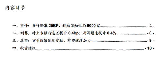 核心观点:1、本次释放流动性约6000亿,其中上市银行释放资金规模在4600亿左右,对上市银行息差提升在0.4bp左右;对利润增速提升0.4%。2、多层因素推动本次降准:缓解资金面、配合政府债发行高峰、维护银行息差、支撑信贷投放。3、展望:降准或为降息打开空间,关注后续地产等复苏指标。