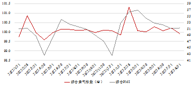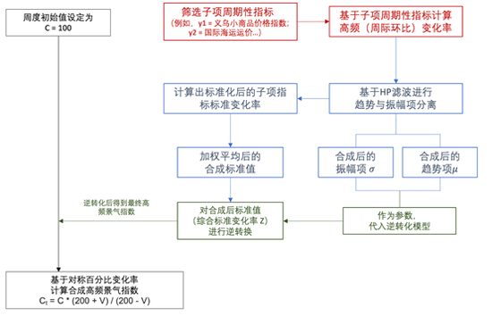 )恢复标准化值背后的原始指标趋势成分。最终,我们得到合成后的高频景气指数。此外,为了平滑单周波动,更好反映长期趋势,我们采用了对称百分比变化率来计算合成后的高频景气指数。